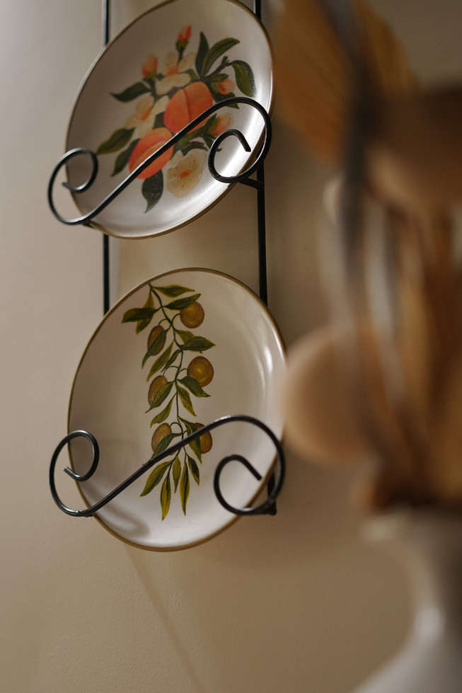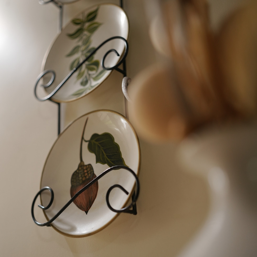 Set if three wall plates in ceramic with hand painting available with metallic stand