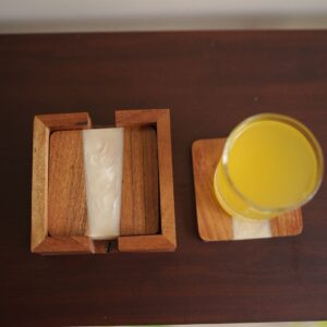Set of 4 coasters and stand made using accasia wood and resin.